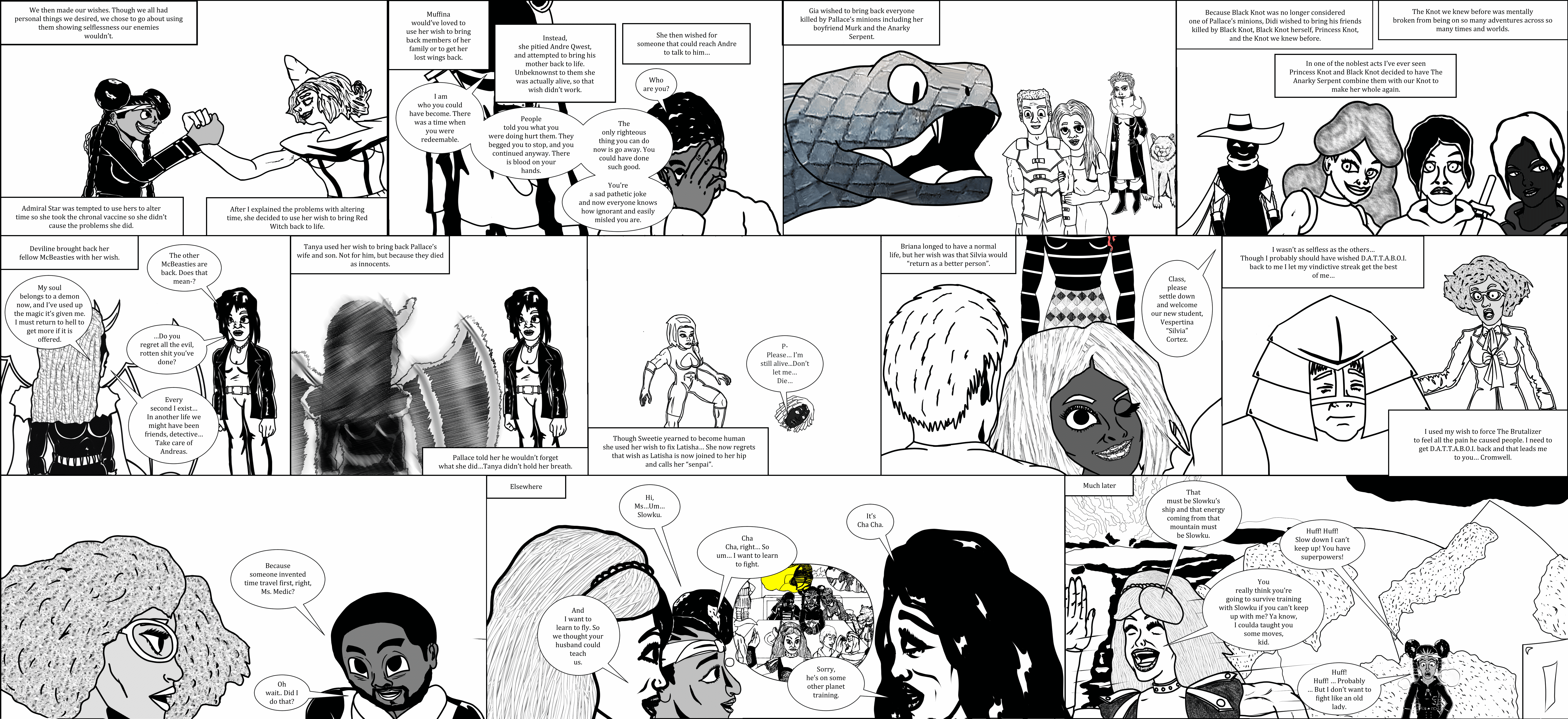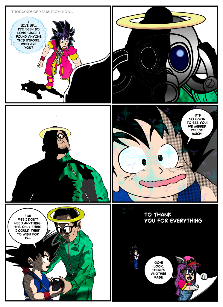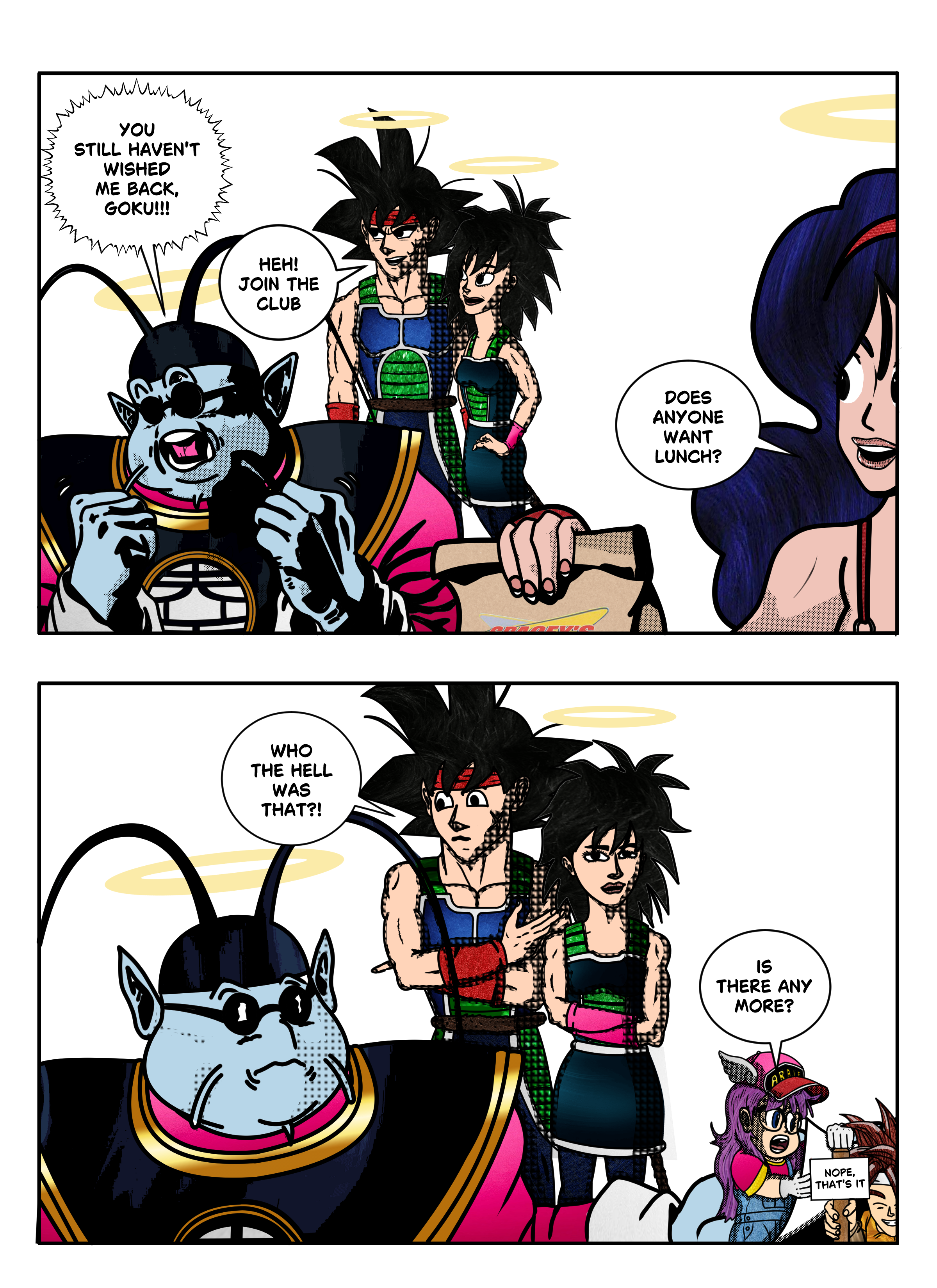 The first panel of the second page features King Kai, Goku’s parents Bardock and Gine, and Launch. Here I’m referencing a running joke in Dragon Ball Super where Goku doesn’t use opportunities to wish King Kai back to life after inadvertently causing his death; fandom discussions of Goku wishing back his parents; and Launch being a forgotten character whose name in Japan is actually Lunch. If you look carefully at the back Launch is holding you can see the somewhat obscured logo to “Spacey’s” a running gag from the Youtube Dragon Ball Z reinterpretation of Dragon Ball Z abridged.