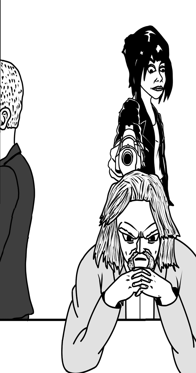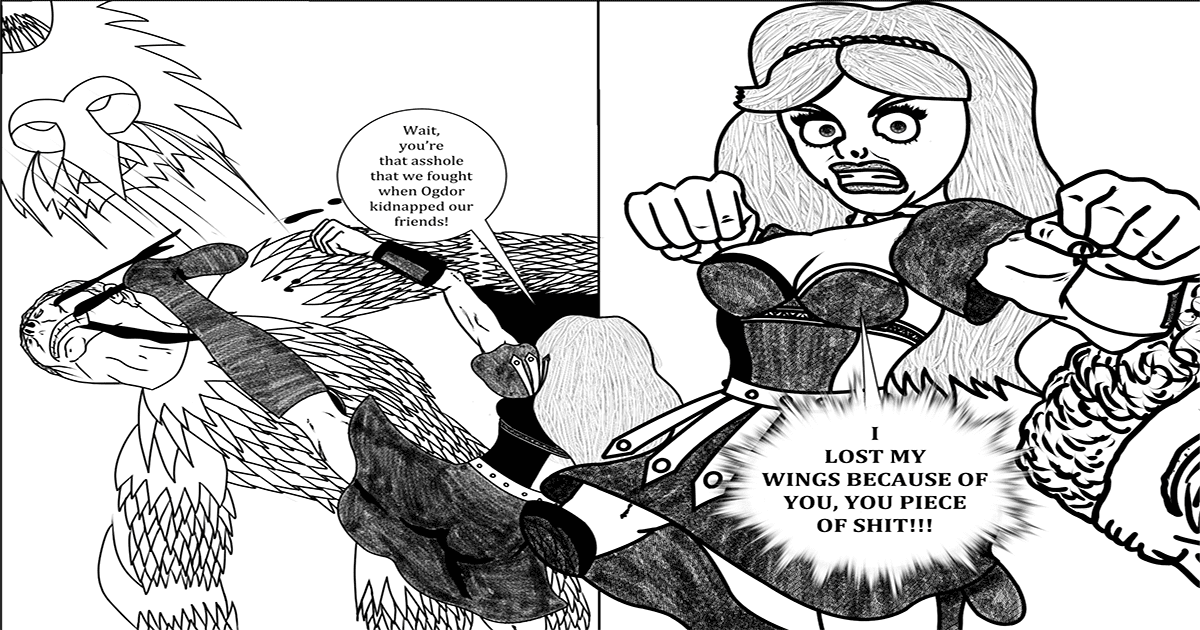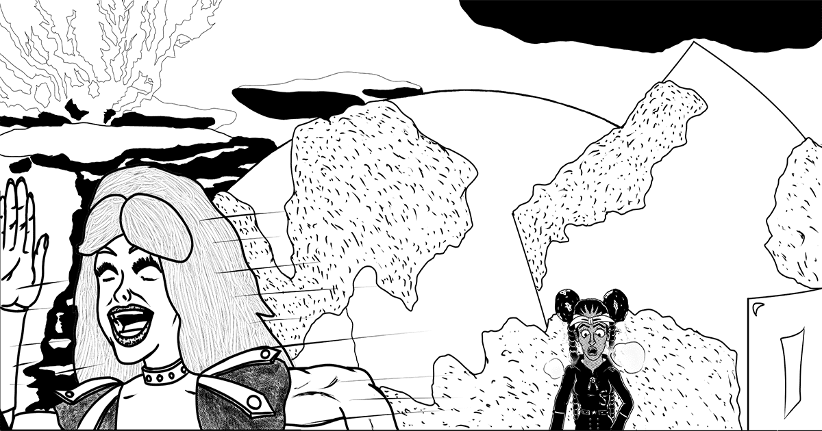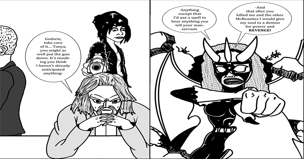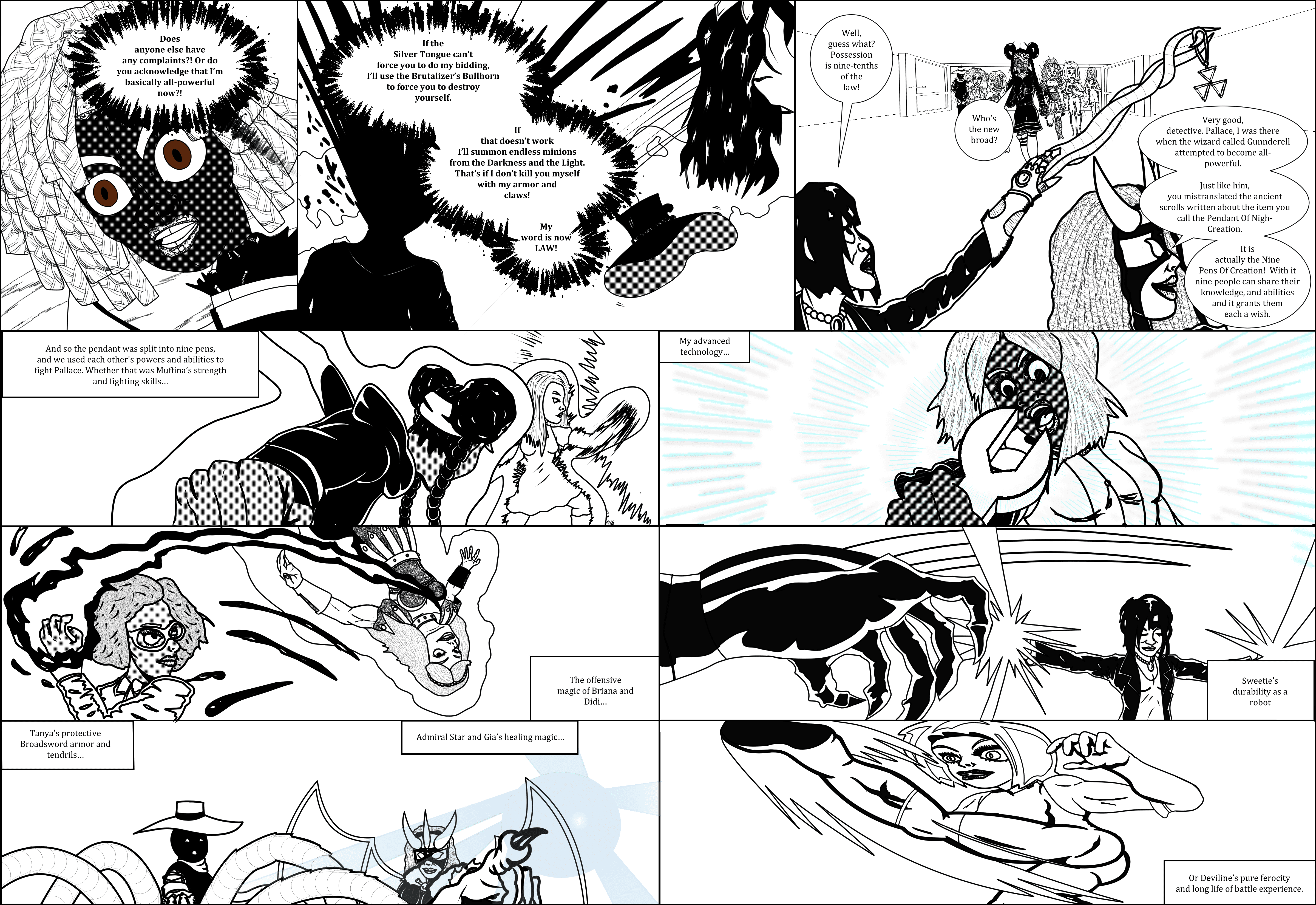 The first panel of the second page features King Kai, Goku’s parents Bardock and Gine, and Launch. Here I’m referencing a running joke in Dragon Ball Super where Goku doesn’t use opportunities to wish King Kai back to life after inadvertently causing his death; fandom discussions of Goku wishing back his parents; and Launch being a forgotten character whose name in Japan is actually Lunch. If you look carefully at the back Launch is holding you can see the somewhat obscured logo to “Spacey’s” a running gag from the Youtube Dragon Ball Z reinterpretation of Dragon Ball Z abridged.