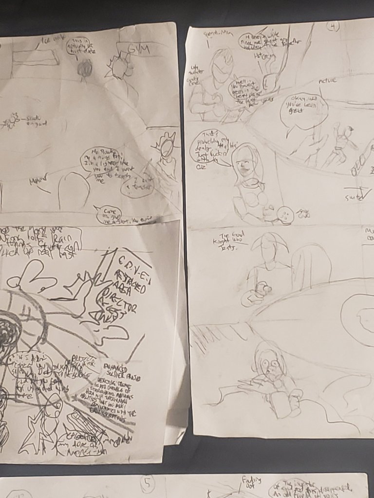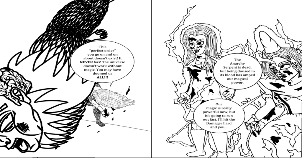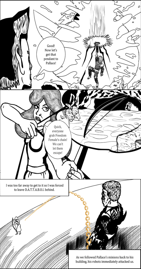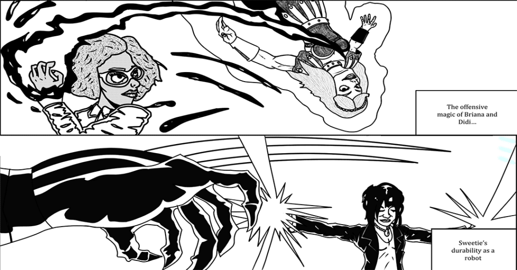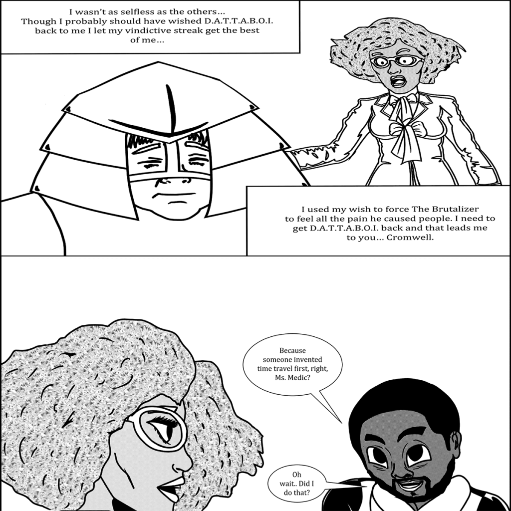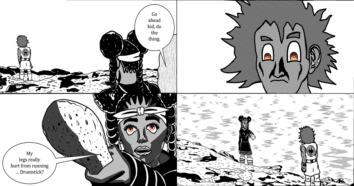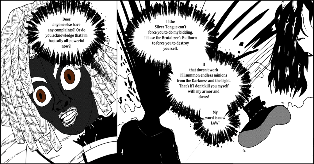 In the first panel, we see a version of Goku who is intended to be the ultimate incarnation of him. I mixed elements of his clothing from Xeno Goku and Capsule Corp Goku (from Super Dragon Ball Heroes). He also wears the colors and symbol of Zeno from Dragon Ball Super. His hair is a mix of Super Saiyan 4 (from Dragon Ball GT) and Ultra Instinct (from Dragon Ball Super) with a hint of the colors from Zeno’s face.