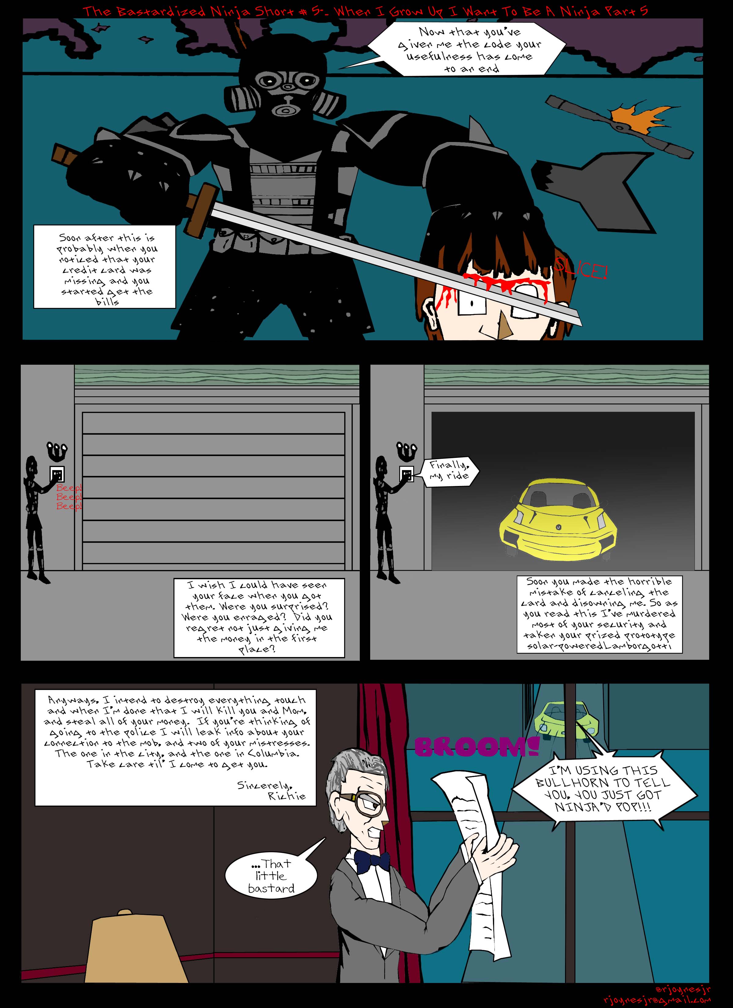 12May2012 The Bastardized Ninja Short #5 “When I Grow Up I Want To Be A Ninja Part 5″ Posted in censoredshort, tbnshort, uncensoredshort by Ricky Joynes Jr. The Bastardized Ninja Short #5 “When I Grow Up I Want To Be A Ninja Part 5″ And now the gripping conclusing to The Bastardized Ninja’s first storyline! No cursing in this one so there’s no censored version… Share this:Tweet Click to print (Opens in new window) Print Click to share on Reddit (Opens in new window) Reddit Share on TumblrLike Loading... Related