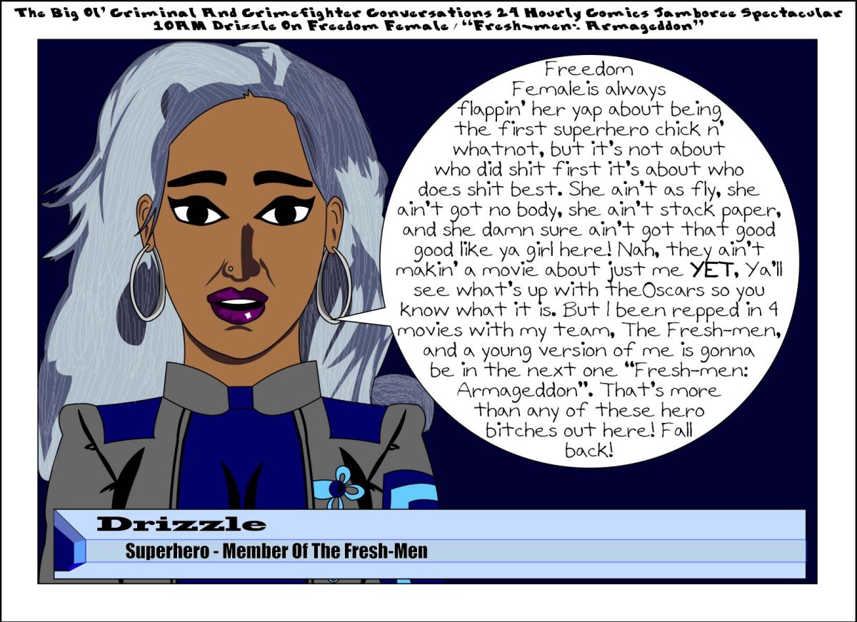24hccc2016-10AMdrizzle Published February 1, 2016 at 1650 × 1200 in The Big Ol’ Criminal And Crimefighter Conversations 24 Hourly Comics Jamboree Spectacular 10AM – Drizzle On Freedom Female / “Fresh-men: Armageddon” Share this:Tweet Click to print (Opens in new window) Print Click to share on Reddit (Opens in new window) Reddit Share on TumblrLike Loading...