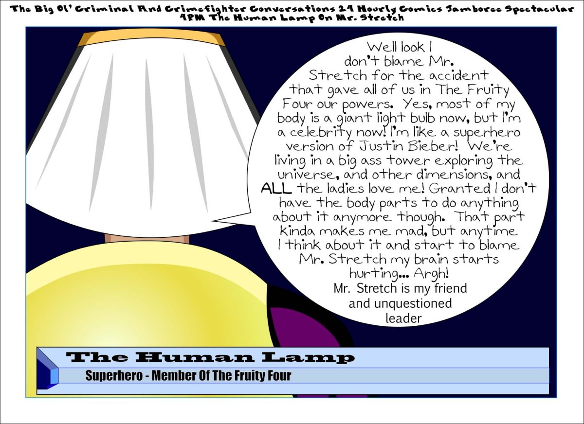 ccc-humanlamptemplate Published February 1, 2016 at 1650 × 1200 in The Big Ol’ Criminal And Crimefighter Conversations 24 Hourly Comics Jamboree Spectacular 4PM – The Human Lamp On Mr. Stretch Share this:Tweet Click to print (Opens in new window) Print Click to share on Reddit (Opens in new window) Reddit Share on TumblrLike Loading...