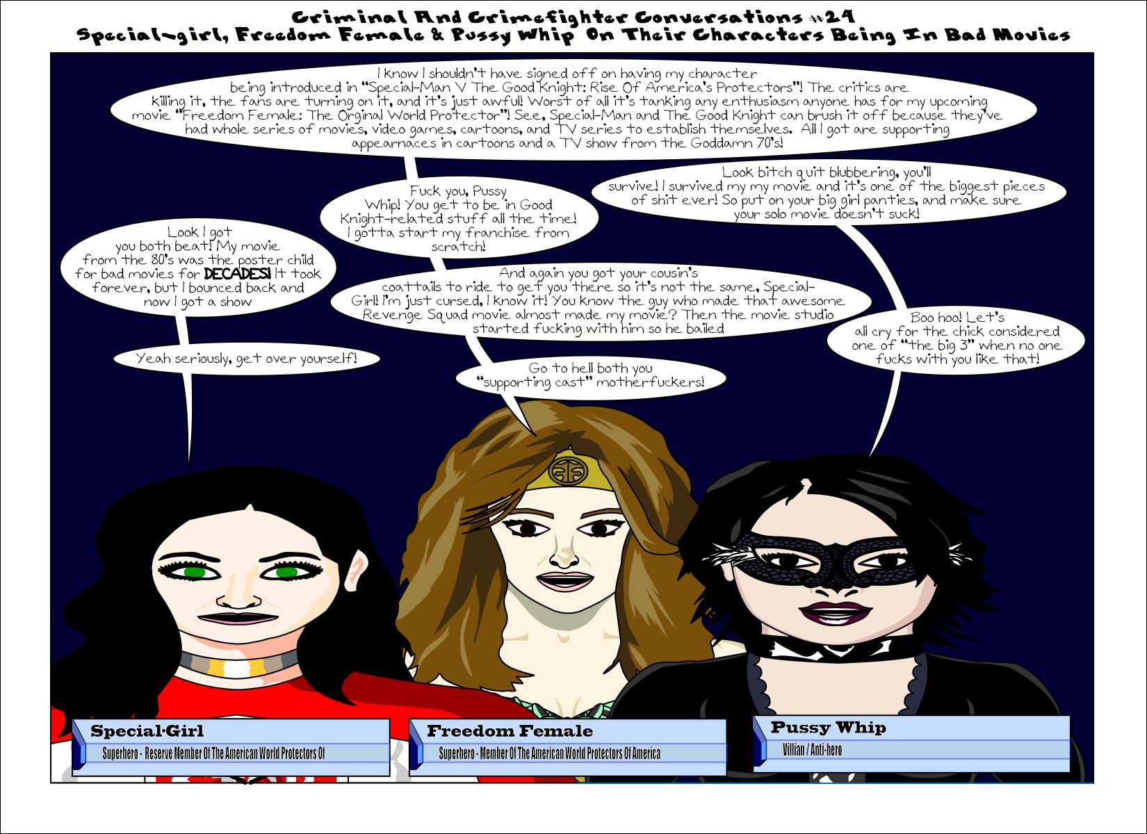 ccc-24-specialgirlfreedomfemalepussywhip Published March 29, 2016 at 1650 × 1200 in Criminal And Crimefighter Conversations #24 Special-Girl, Freedom Female, & Pussy Whip On Their Characters Being In Bad Movies Share this:Tweet Click to print (Opens in new window) Print Click to share on Reddit (Opens in new window) Reddit Share on TumblrLike Loading...