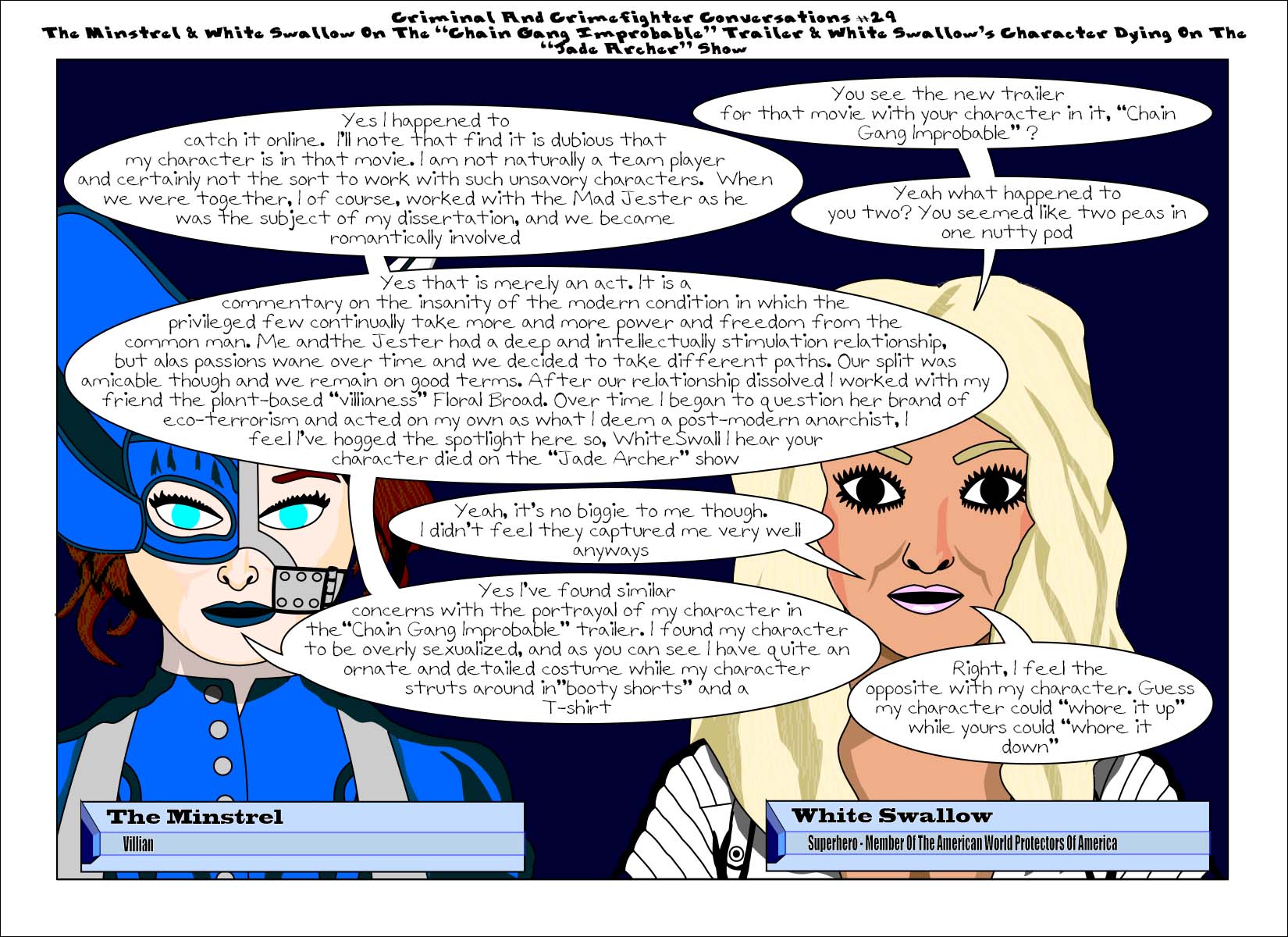 ccc-29-theminstrelandwhiteswallow Published April 12, 2016 at 1650 × 1200 in Criminal And Crimefighter Conversations #29 The Minstrel And White Swallow On The “Chain Gang Improbable” Trailer And White Swallow’s Character Dying On The “Jade Archer” Show Share this:Tweet Click to print (Opens in new window) Print Click to share on Reddit (Opens in new window) Reddit Share on TumblrLike Loading...