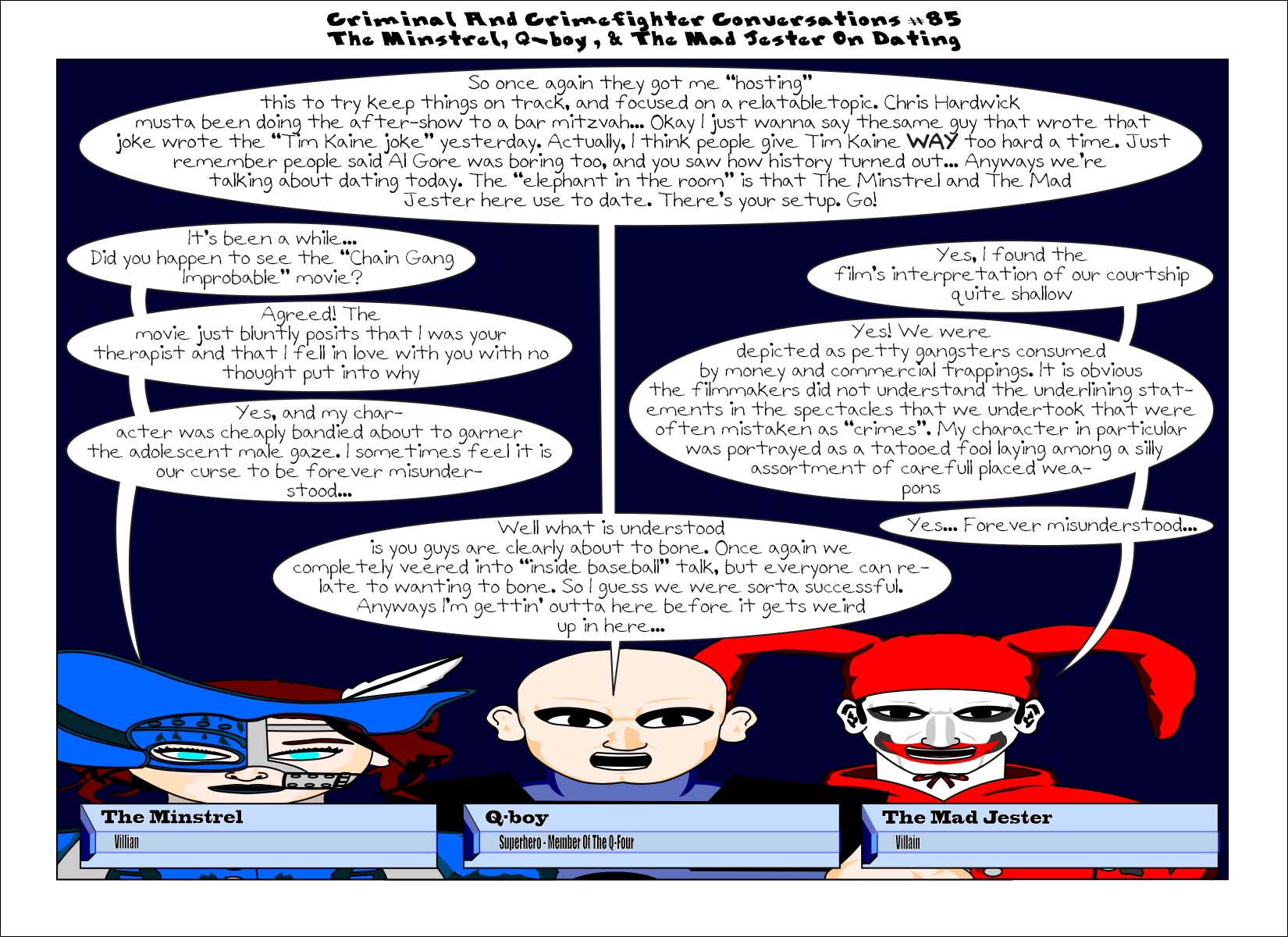 ccc-85-theminstrelqboymadjester Published August 10, 2016 at 1650 × 1200 in Criminal And Crimefighter Conversations #85 The Minstrel, Q-boy, & The Mad Jester On Dating Share this:Tweet Click to print (Opens in new window) Print Click to share on Reddit (Opens in new window) Reddit Share on TumblrLike Loading...