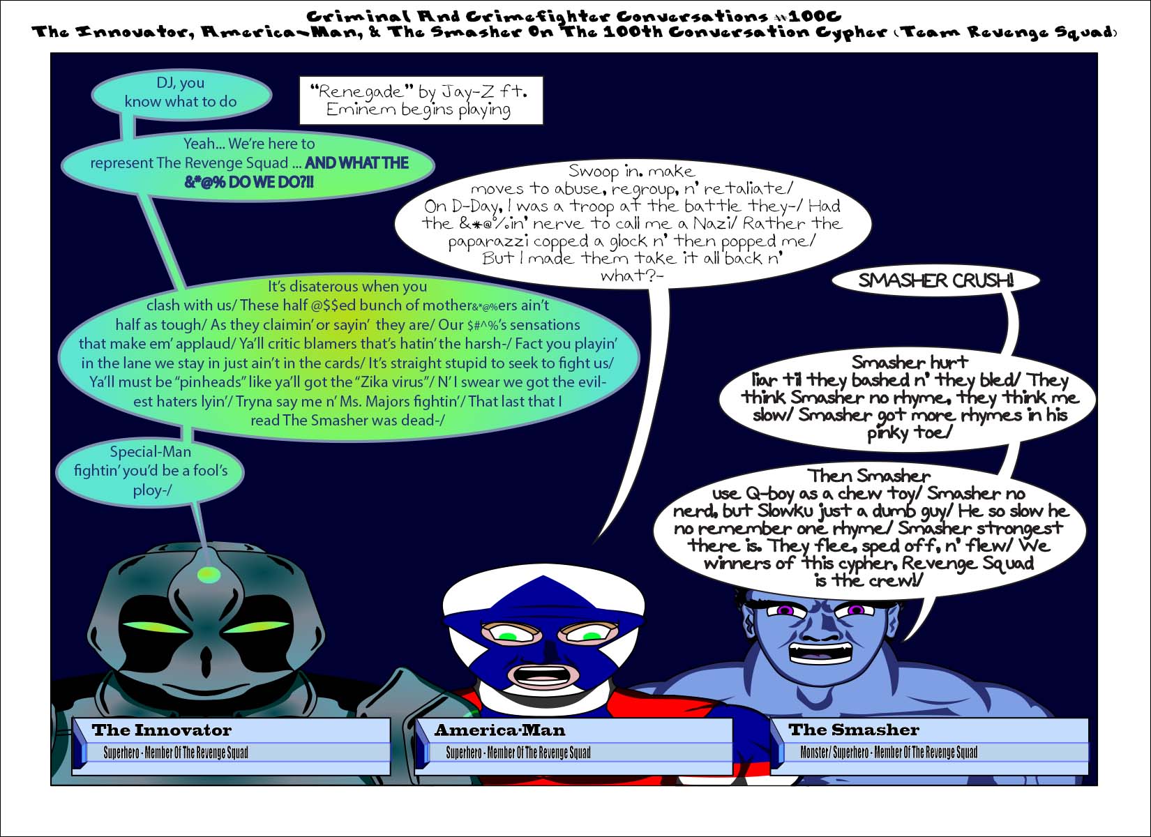 ccc-100c-theinnovatoramericamansmasherc Published September 14, 2016 at 1650 × 1200 in Criminal And Crimefighter Conversations #100A-D The 100th Conversation Cyphers (Censored) « Previous Next » Share this:Tweet Click to print (Opens in new window) Print Click to share on Reddit (Opens in new window) Reddit Share on TumblrLike Loading...
