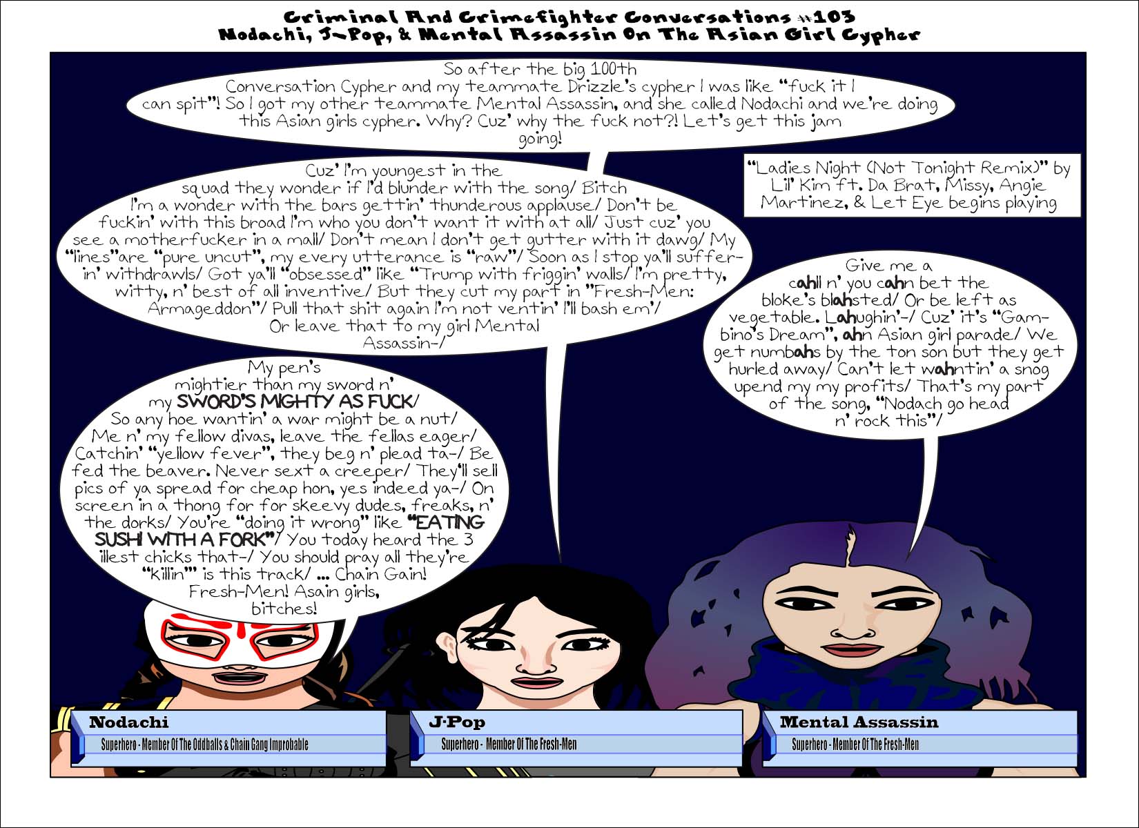 ccc-103-nodachij-popandmentalassassin Published September 21, 2016 at 1650 × 1200 in Criminal And Crimefighter Conversations #103 Nodachi, J-Pop, & Mental Assassin On The Asian Girl Cypher Share this:Tweet Click to print (Opens in new window) Print Click to share on Reddit (Opens in new window) Reddit Share on TumblrLike Loading...