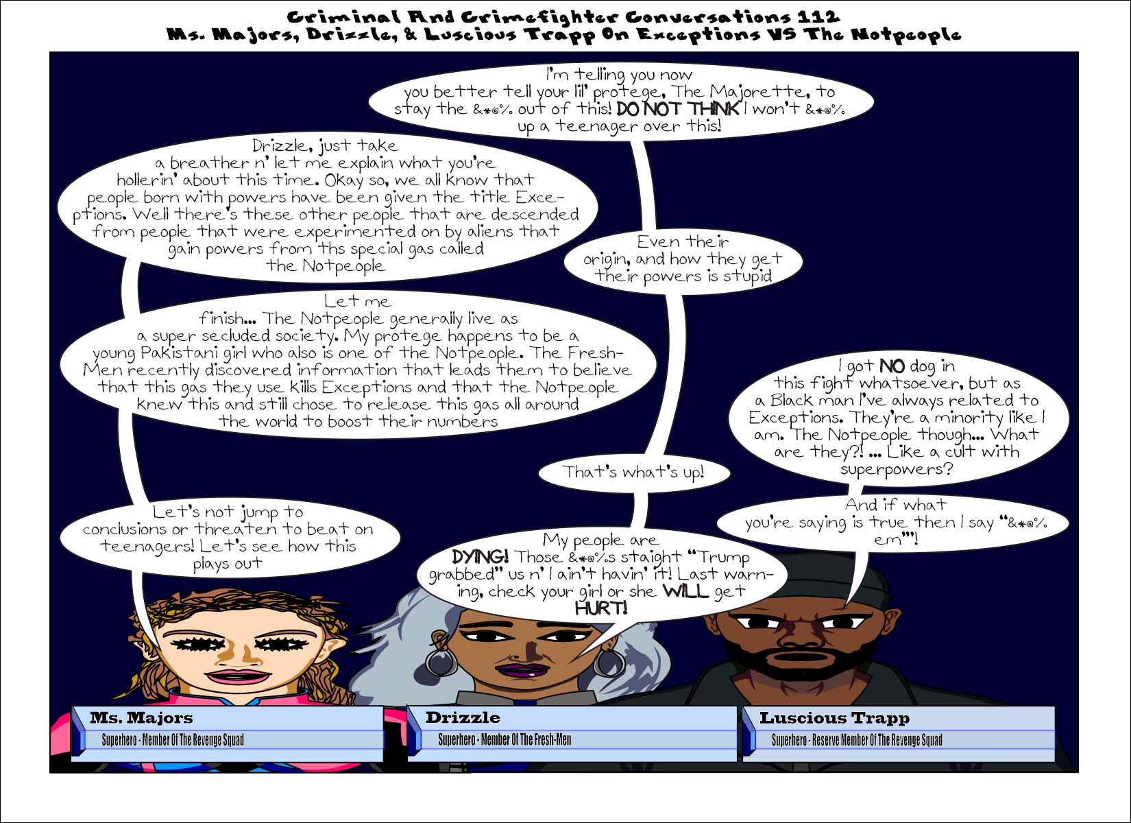 ccc-112-msmajorsdrizzleandlouscioustrappc Published October 12, 2016 at 1650 × 1200 in Criminal And Crimefighter Conversations #112 Ms. Majors, Drizzle, & Luscious Trapp On Exceptions VS The Notpeople (Censored) Share this:Tweet Click to print (Opens in new window) Print Click to share on Reddit (Opens in new window) Reddit Share on TumblrLike Loading...