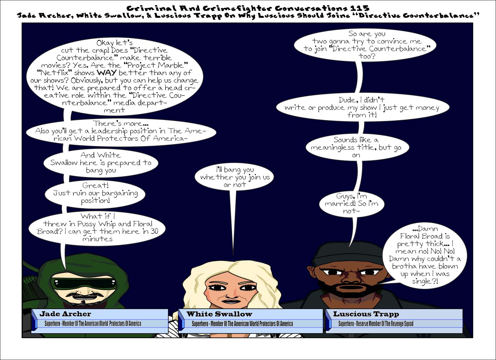 ccc-115-jadearcherwhiteswallowandluscioustrapp Published October 19, 2016 at 1650 × 1200 in Criminal And Crimefighter Conversations #115 Jade Archer, White Swallow, & Luscious Trapp On Why Luscious Should Join “Directive Counterbalance” Share this:Tweet Click to print (Opens in new window) Print Click to share on Reddit (Opens in new window) Reddit Share on TumblrLike Loading...