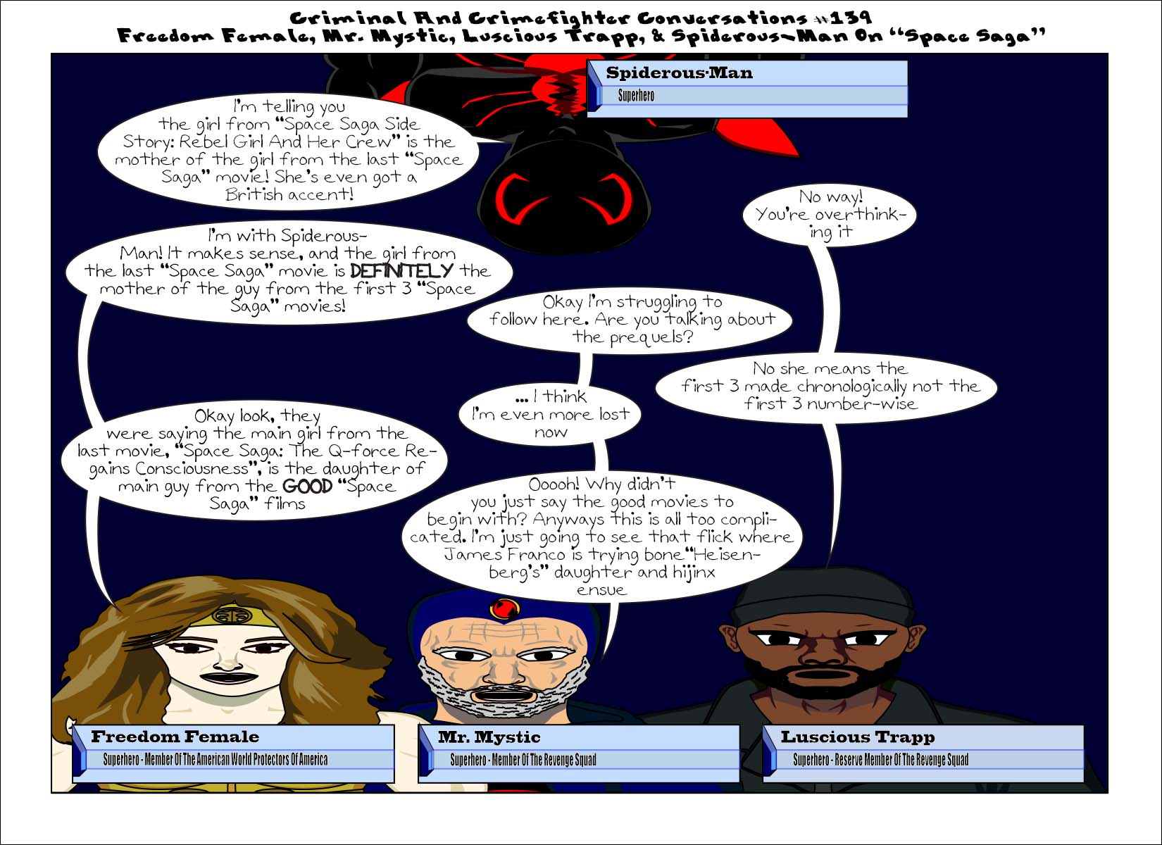ccc-139-freedomfemalemrmysticandluscioustrappandspiderousmantemplate-01 Published December 13, 2016 at 1650 × 1200 in Criminal And Crimefighter Conversations #139 Freedom Female, Mr. Mystic, Luscious Trapp, & Spiderous-Man On “Space Saga” Share this:Tweet Click to print (Opens in new window) Print Click to share on Reddit (Opens in new window) Reddit Share on TumblrLike Loading...