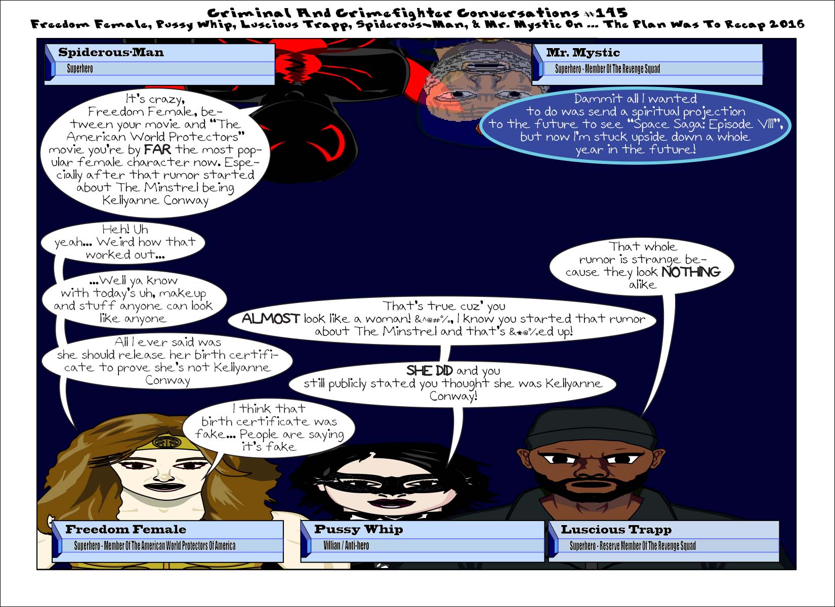 ccc-145-freedomfemalepussywhipluscioustrappspiderousmanandmrmyst Published December 27, 2016 at 1650 × 1200 in Criminal And Crimefighter Conversatione #145 – Freedom Female, Pussy Whip, Luscious Trapp, Spiderous-Man, & Mr. Mystic… The Plan Was To Recap 2016 (Censored) Share this:Tweet Click to print (Opens in new window) Print Click to share on Reddit (Opens in new window) Reddit Share on TumblrLike Loading...