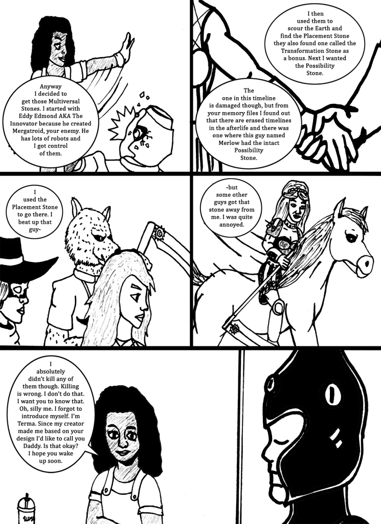 In this altered timeline (in another story A 4th October Surprise: The Four Horsemen Of Horror) the living embodiment of Horror and his 4 horsemen rule. Eventually, Adapter Droid along with a group of heroes defeats them and returns things to normal. One of those heroes, Muffina Winters (Buffy The Vampire Slayer) decides to use another of the Multiversal Stones to resurrect her dead sister Autumn. In her search for it, she and a group of other heroes discover a shadowy group known as Fox, Goat, & Soul (Wolfram & Heart from Angel) want to use it to replace the Multiverse with one shaped in their vision. Among this group is a robot called Terma (Arale from Dr. Slump) who was created based on Adapter Droids design. Terma is convinced to protect the Multiverse rather than replace it and helps the heroes stop Fox, Goat, & Soul from achieving their goals.