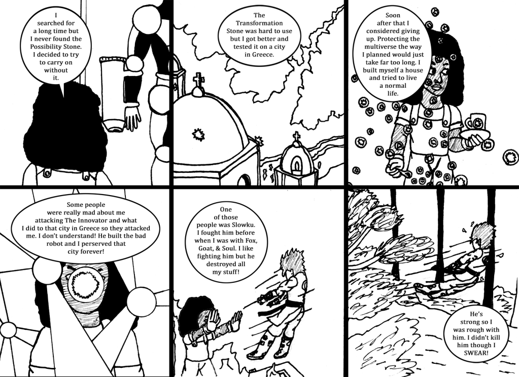 In this altered timeline (in another story A 4th October Surprise: The Four Horsemen Of Horror) the living embodiment of Horror and his 4 horsemen rule. Eventually, Adapter Droid along with a group of heroes defeats them and returns things to normal. One of those heroes, Muffina Winters (Buffy The Vampire Slayer) decides to use another of the Multiversal Stones to resurrect her dead sister Autumn. In her search for it, she and a group of other heroes discover a shadowy group known as Fox, Goat, & Soul (Wolfram & Heart from Angel) want to use it to replace the Multiverse with one shaped in their vision. Among this group is a robot called Terma (Arale from Dr. Slump) who was created based on Adapter Droids design. Terma is convinced to protect the Multiverse rather than replace it and helps the heroes stop Fox, Goat, & Soul from achieving their goals.