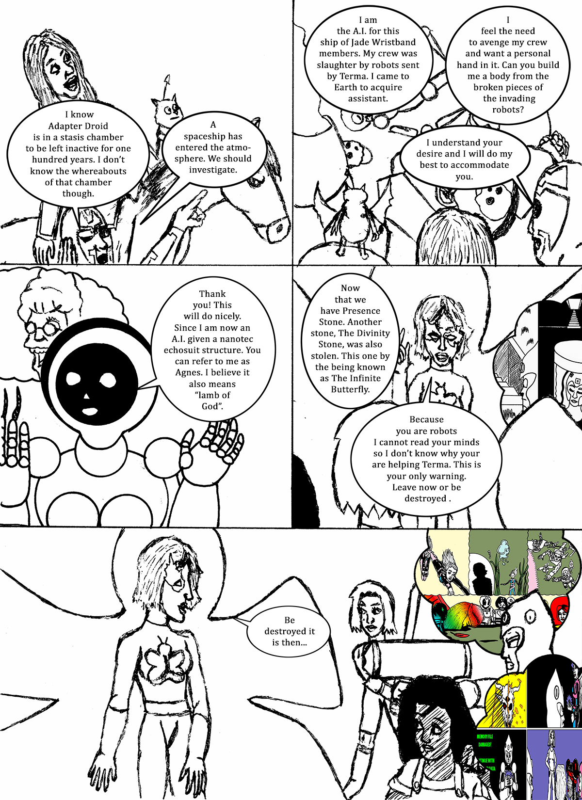 In this altered timeline (in another story A 4th October Surprise: The Four Horsemen Of Horror) the living embodiment of Horror and his 4 horsemen rule. Eventually, Adapter Droid along with a group of heroes defeats them and returns things to normal. One of those heroes, Muffina Winters (Buffy The Vampire Slayer) decides to use another of the Multiversal Stones to resurrect her dead sister Autumn. In her search for it, she and a group of other heroes discover a shadowy group known as Fox, Goat, & Soul (Wolfram & Heart from Angel) want to use it to replace the Multiverse with one shaped in their vision. Among this group is a robot called Terma (Arale from Dr. Slump) who was created based on Adapter Droids design. Terma is convinced to protect the Multiverse rather than replace it and helps the heroes stop Fox, Goat, & Soul from achieving their goals.