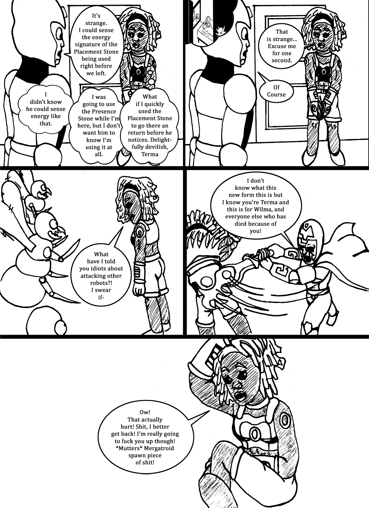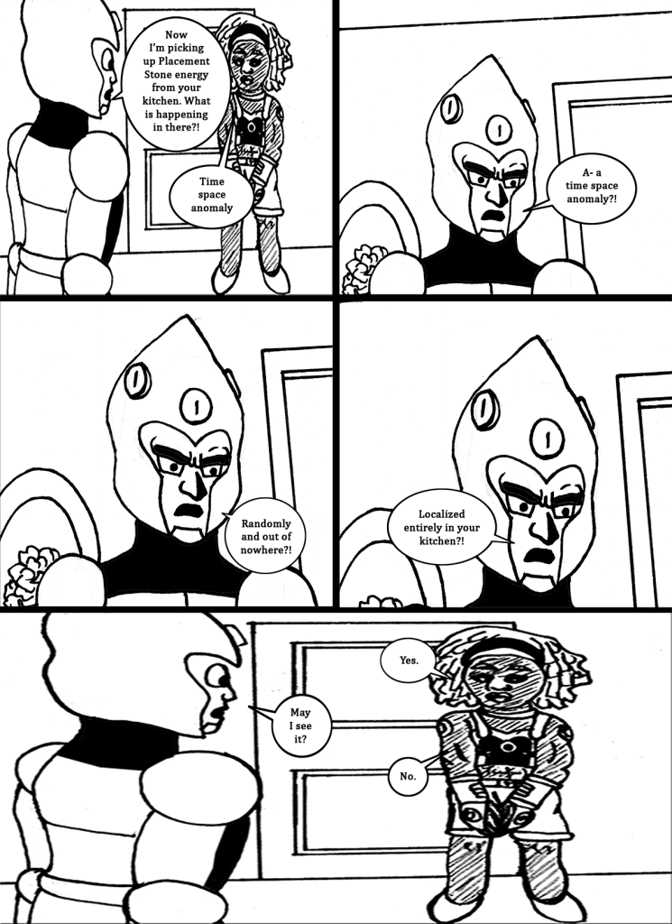 In this altered timeline (in another story A 4th October Surprise: The Four Horsemen Of Horror) the living embodiment of Horror and his 4 horsemen rule. Eventually, Adapter Droid along with a group of heroes defeats them and returns things to normal. One of those heroes, Muffina Winters (Buffy The Vampire Slayer) decides to use another of the Multiversal Stones to resurrect her dead sister Autumn. In her search for it, she and a group of other heroes discover a shadowy group known as Fox, Goat, & Soul (Wolfram & Heart from Angel) want to use it to replace the Multiverse with one shaped in their vision. Among this group is a robot called Terma (Arale from Dr. Slump) who was created based on Adapter Droids design. Terma is convinced to protect the Multiverse rather than replace it and helps the heroes stop Fox, Goat, & Soul from achieving their goals.