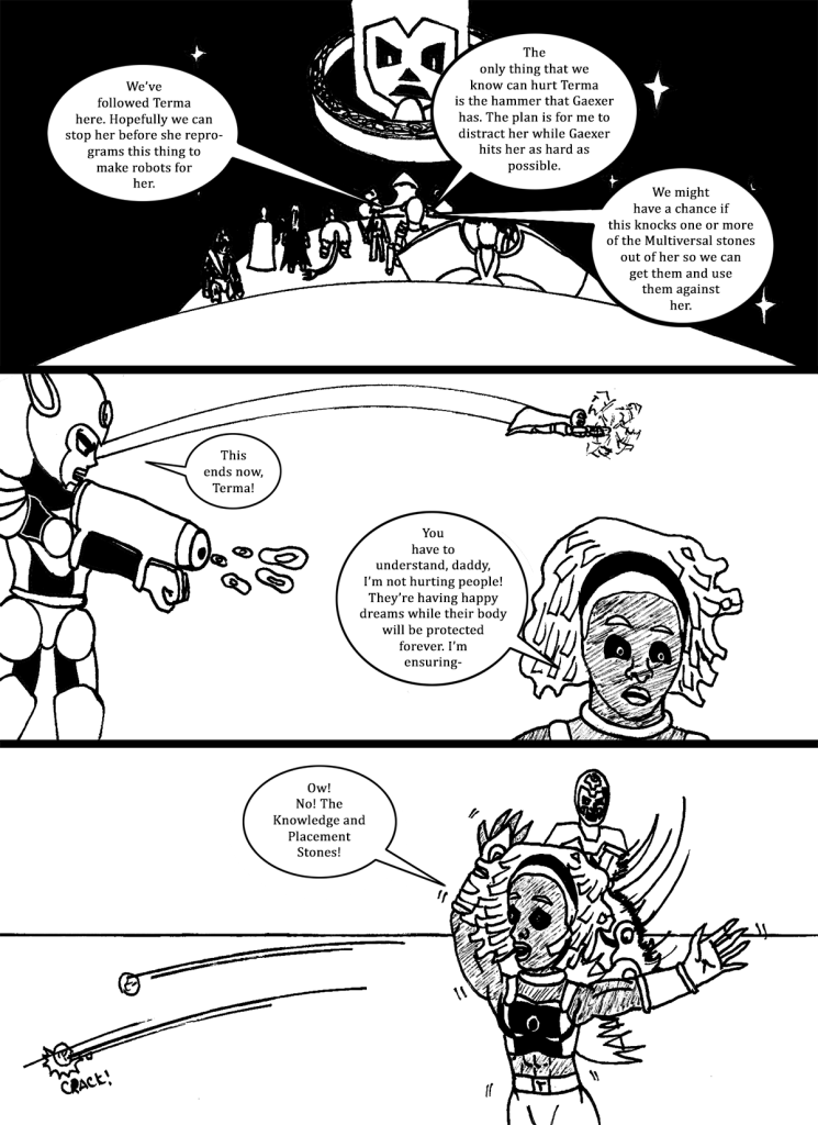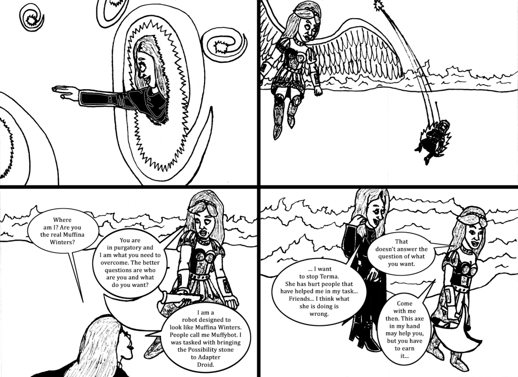 In this altered timeline (in another story A 4th October Surprise: The Four Horsemen Of Horror) the living embodiment of Horror and his 4 horsemen rule. Eventually, Adapter Droid along with a group of heroes defeats them and returns things to normal. One of those heroes, Muffina Winters (Buffy The Vampire Slayer) decides to use another of the Multiversal Stones to resurrect her dead sister Autumn. In her search for it, she and a group of other heroes discover a shadowy group known as Fox, Goat, & Soul (Wolfram & Heart from Angel) want to use it to replace the Multiverse with one shaped in their vision. Among this group is a robot called Terma (Arale from Dr. Slump) who was created based on Adapter Droids design. Terma is convinced to protect the Multiverse rather than replace it and helps the heroes stop Fox, Goat, & Soul from achieving their goals.