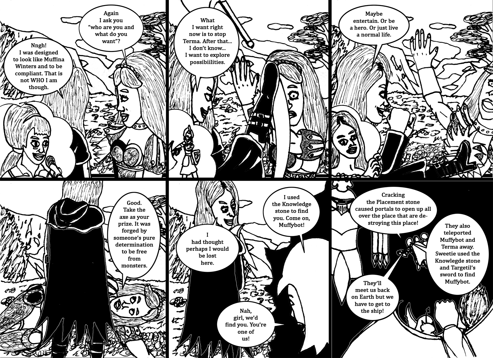 In this altered timeline (in another story A 4th October Surprise: The Four Horsemen Of Horror) the living embodiment of Horror and his 4 horsemen rule. Eventually, Adapter Droid along with a group of heroes defeats them and returns things to normal. One of those heroes, Muffina Winters (Buffy The Vampire Slayer) decides to use another of the Multiversal Stones to resurrect her dead sister Autumn. In her search for it, she and a group of other heroes discover a shadowy group known as Fox, Goat, & Soul (Wolfram & Heart from Angel) want to use it to replace the Multiverse with one shaped in their vision. Among this group is a robot called Terma (Arale from Dr. Slump) who was created based on Adapter Droids design. Terma is convinced to protect the Multiverse rather than replace it and helps the heroes stop Fox, Goat, & Soul from achieving their goals.