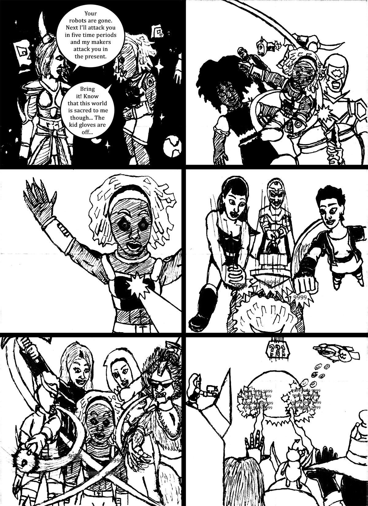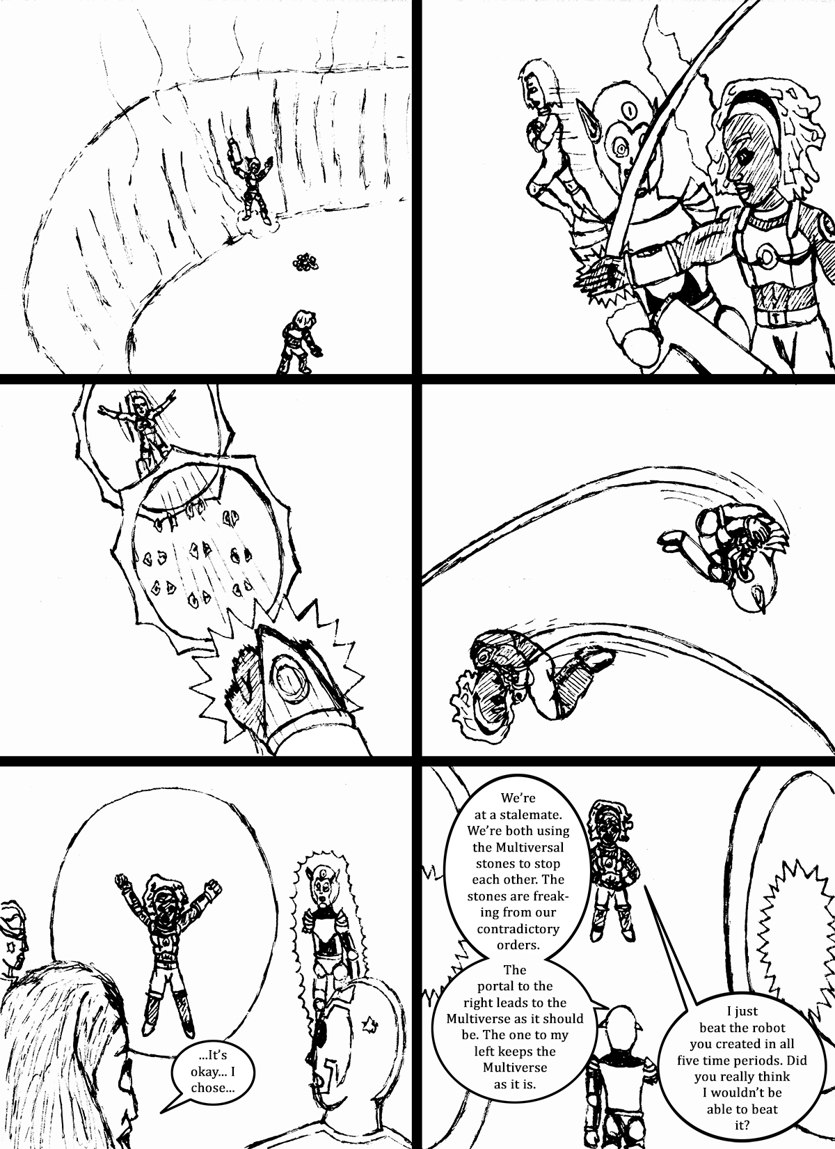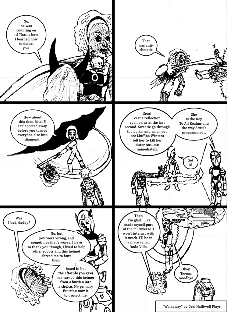 In this altered timeline (in another story A 4th October Surprise: The Four Horsemen Of Horror) the living embodiment of Horror and his 4 horsemen rule. Eventually, Adapter Droid along with a group of heroes defeats them and returns things to normal. One of those heroes, Muffina Winters (Buffy The Vampire Slayer) decides to use another of the Multiversal Stones to resurrect her dead sister Autumn. In her search for it, she and a group of other heroes discover a shadowy group known as Fox, Goat, & Soul (Wolfram & Heart from Angel) want to use it to replace the Multiverse with one shaped in their vision. Among this group is a robot called Terma (Arale from Dr. Slump) who was created based on Adapter Droids design. Terma is convinced to protect the Multiverse rather than replace it and helps the heroes stop Fox, Goat, & Soul from achieving their goals.