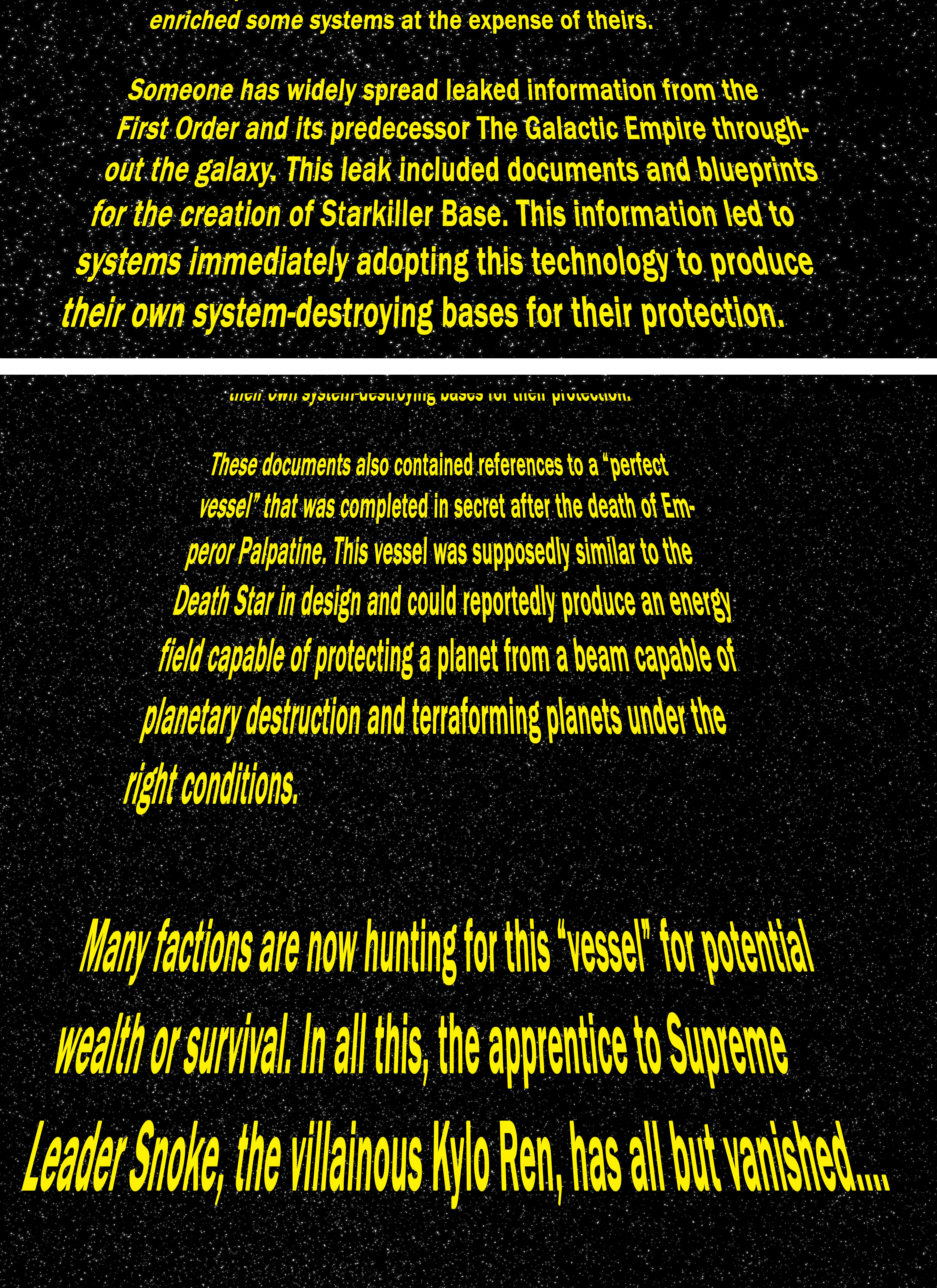 Someone has widely spread leaked information from the First Order and its predecessor The Galactic Empire throughout the galaxy. This leak included documents and blueprints for the creation of Starkiller Base. This information led to systems immediately adopting this technology to produce their own system-destroying bases for their protection.
