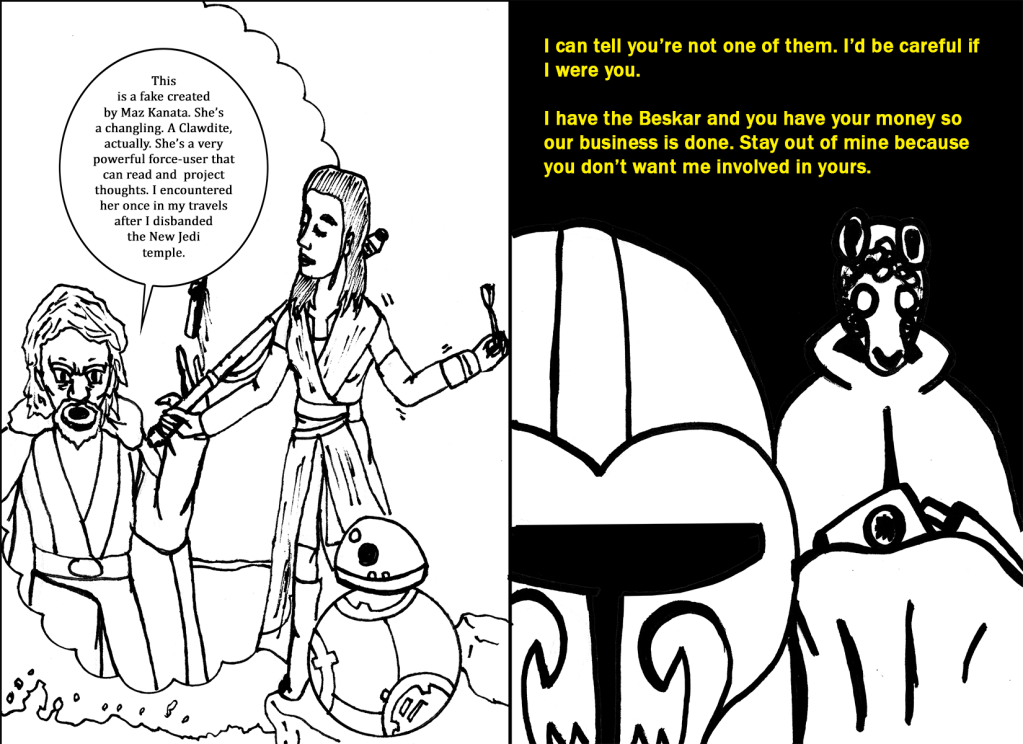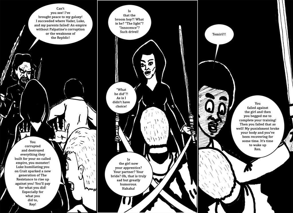 Since the Inktober of 2017, Iโve been taking prompts from these types of drawing challenges and weaving them into stories featuring my versions of many comic book and other pop culture characters. This time Iโm doing something different. This time Iโm doing a fan fiction alternative story for Star Wars: Episode VIII – The Last Jedi. I had the basic idea for this years ago but I just kept thinking โwhy botherโ. Now Iโm like โwhat the hellโ. The original title I had for this was โThe Perfect Vessel Unveiledโ but literally today I thought of โThe Nightmare Of The First Orderโ works better and it plays off the โAwakensโ part of โThe Force Awakensโ.