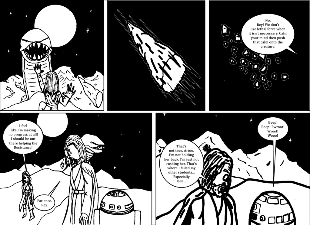 Since the Inktober of 2017, Iโve been taking prompts from these types of drawing challenges and weaving them into stories featuring my versions of many comic book and other pop culture characters. This time Iโm doing something different. This time Iโm doing a fan fiction alternative story for Star Wars: Episode VIII – The Last Jedi. I had the basic idea for this years ago but I just kept thinking โwhy botherโ. Now Iโm like โwhat the hellโ. The original title I had for this was โThe Perfect Vessel Unveiledโ but literally today I thought of โThe Nightmare Of The First Orderโ works better and it plays off the โAwakensโ part of โThe Force Awakensโ.