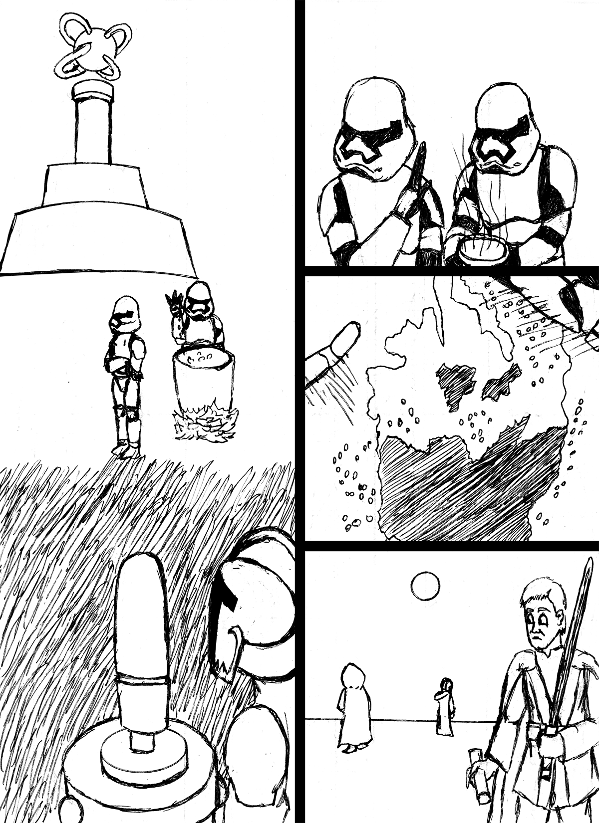 Since the Inktober of 2017, Iโve been taking prompts from these types of drawing challenges and weaving them into stories featuring my versions of many comic book and other pop culture characters. This time Iโm doing something different. This time Iโm doing a fan fiction alternative story for Star Wars: Episode VIII – The Last Jedi. I had the basic idea for this years ago but I just kept thinking โwhy botherโ. Now Iโm like โwhat the hellโ. The original title I had for this was โThe Perfect Vessel Unveiledโ but literally today I thought of โThe Nightmare Of The First Orderโ works better and it plays off the โAwakensโ part of โThe Force Awakensโ.