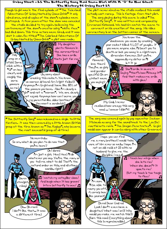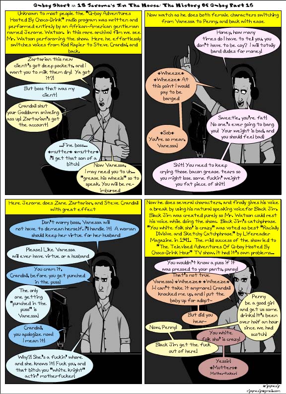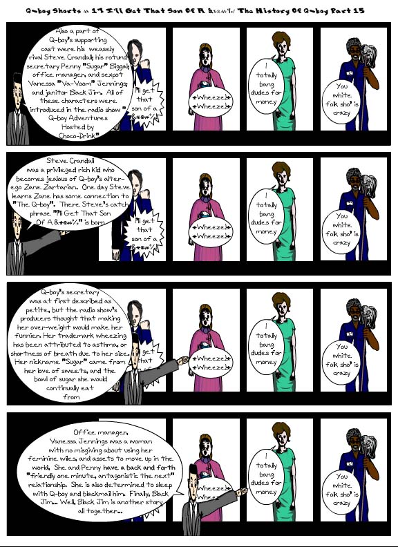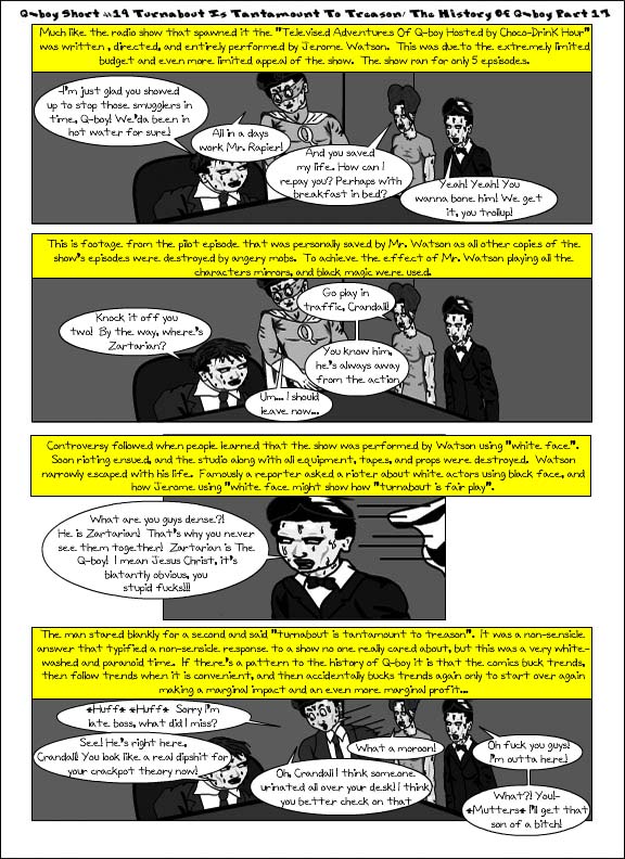 So the first part of this comic where Q-boy talks about his boss refers back to Q-boy Short # 16, 18, & 19 (which you can check out at https://qboyandtheninja.com/2014/02/09/qbs16/ , https://qboyandtheninja.com/2014/02/09/qbs16/ , & https://qboyandtheninja.com/2014/09/14/qbs19/ respectively). Q-boy’s boss Rod Rapier is based on Don Draper from Mad Men.