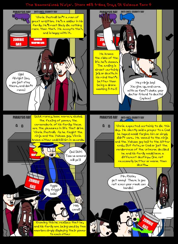 So who’da thought Mobsters + Zombie Gas (seen in The Bastardized Ninja # 28 or the censored verison) = Zombie Mobsters? If you go back a bit you see that this comic closely matches The Bastardized Ninja # 6 or the censored version. You’ll also notice Patrick and Cuntasia look vastly improved now. Besides just naturally getting better drawing over time this is because The Bastardized Ninja #6 was the first one I drew using Abobe Flash, and was the first comic I did entirely digitally with the convertible laptop I use today. In the earlier comics I drew them on paper, scanned them, then colored, lettered, and all the rest in Photoshop. What’s next for the Zombie Mobsters? Stay tuned, and find out. I actually remembered Christmas was coming soon enough to actually do something, so… If all goes as planned in place of the usual Q-boy short there may be a little holiday surprise. That’s it for now, protect your brains, play with your cats, and don’t piss off guys named Patrick. See ya next time!