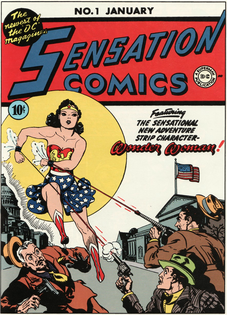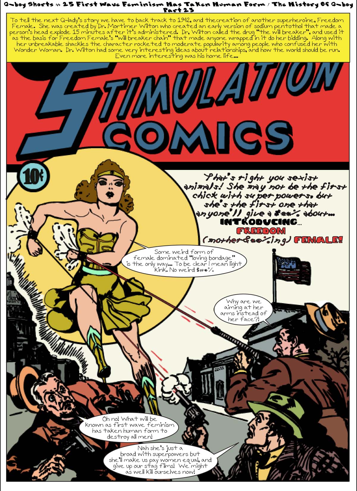 So there’s a lot going on with this one… Let’s start with some Wonder Woman history as that is who Freedom Female is based on. Wonder Woman was created by William Moulton Marston who also happened to invent the lie detector. He was way into the idea that women should run the world and something about “loving bondage”. He also had a poly relationship with 2 women, one of which he married, and they all lived together. For the hell of it I made the 2 women black and hispanic to add some diversity. Sandra Christie I based very loosely on Jackie Ormes who was the first black woman to create a syndicated comic strip. The character The Red Q Lady is a combination of Jackie’s character Torchy Brown and the Woman In Red who was a female crimefighter in the very early days of comics. Both characters are explained more on this article on the site ComicBookGrrrl.com. The first panel is based on the first panel of the Woman In Red comic below…